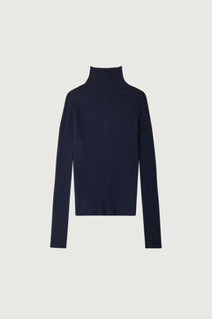 FINN is a long double-faced navy wool coat, with a loose fit and mid-calf length. Its round neckline and button placket add sophistication. Hidden side pockets and the integrated removable scarf provide warmth and comfort for winter.