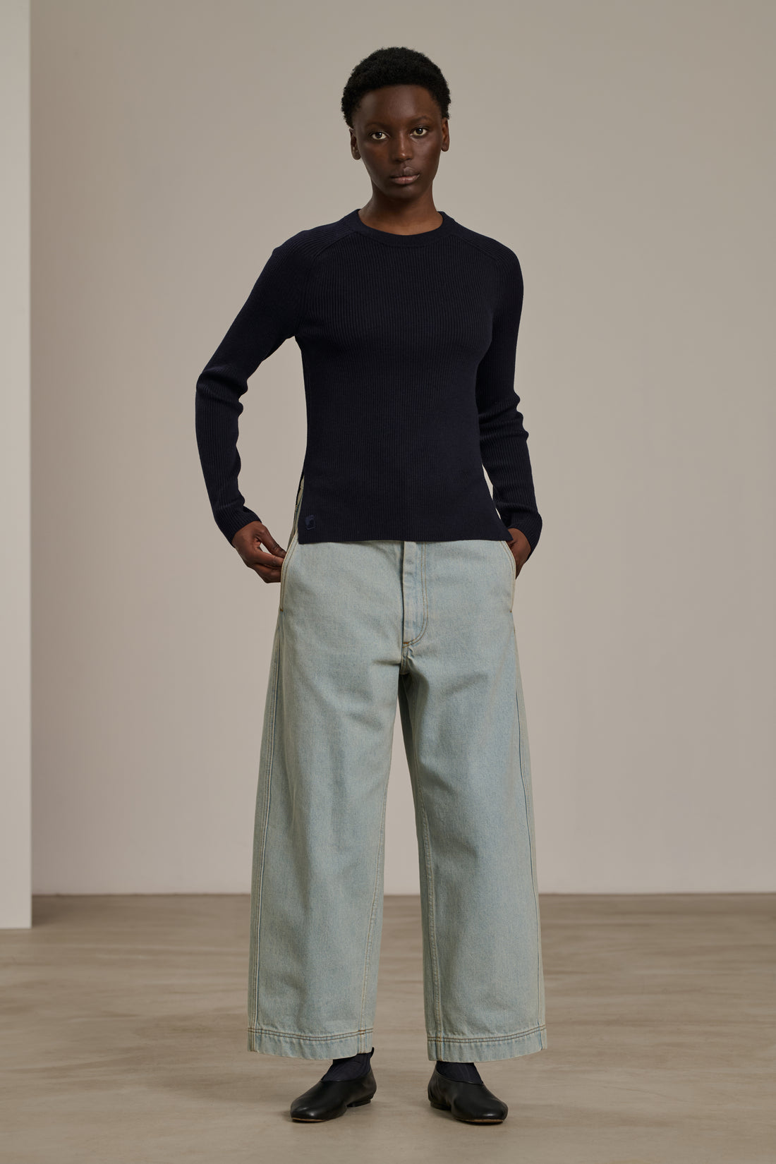VERONA is a merino wool jumper with long sleeves, designed to be fitted and featuring a ribbed knit effect. It stands out with its side slits, adding a modern twist to its classic cut. Adorned with our tonal signature, it's a timeless piece that combines elegance and comfort.