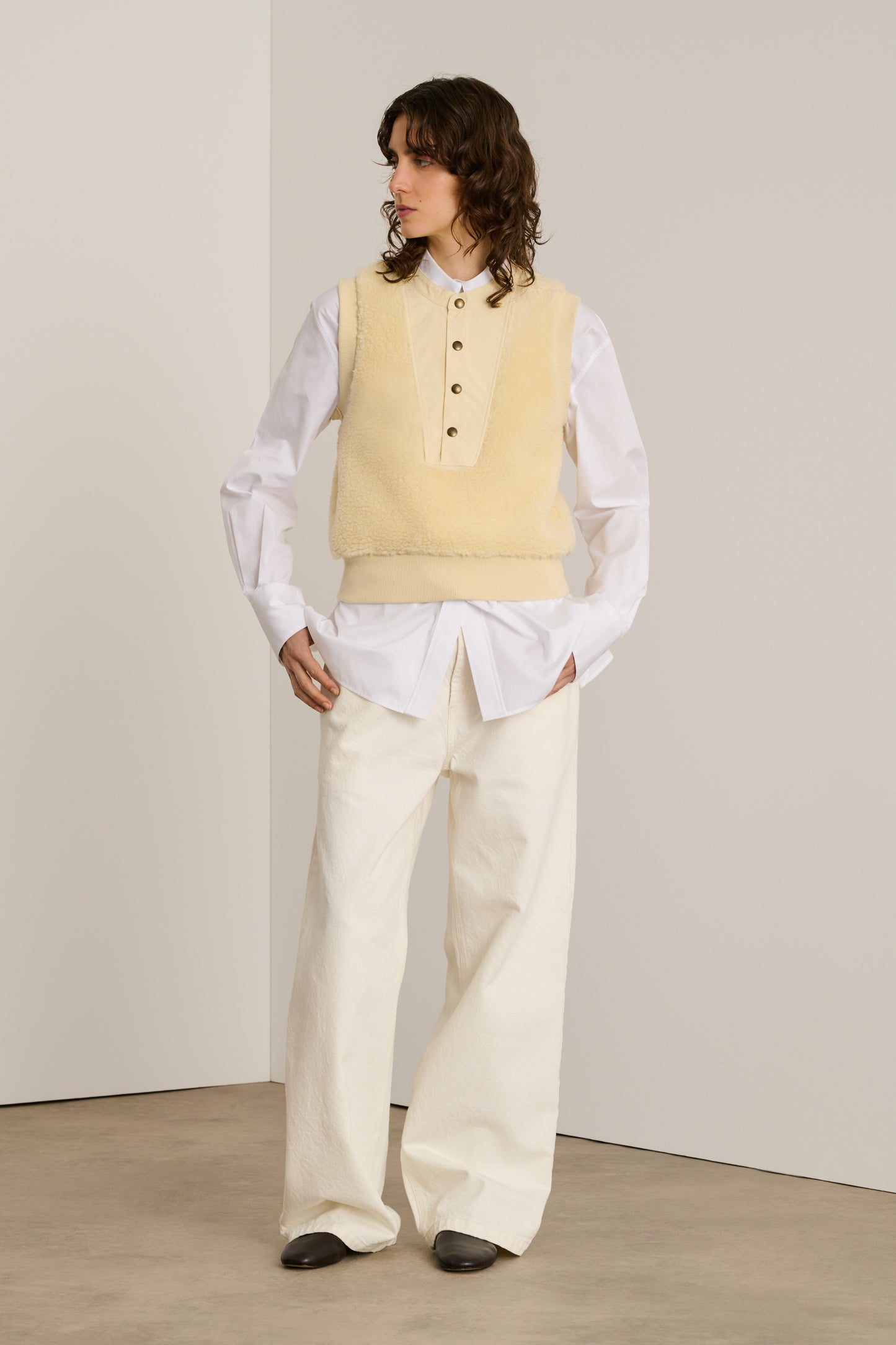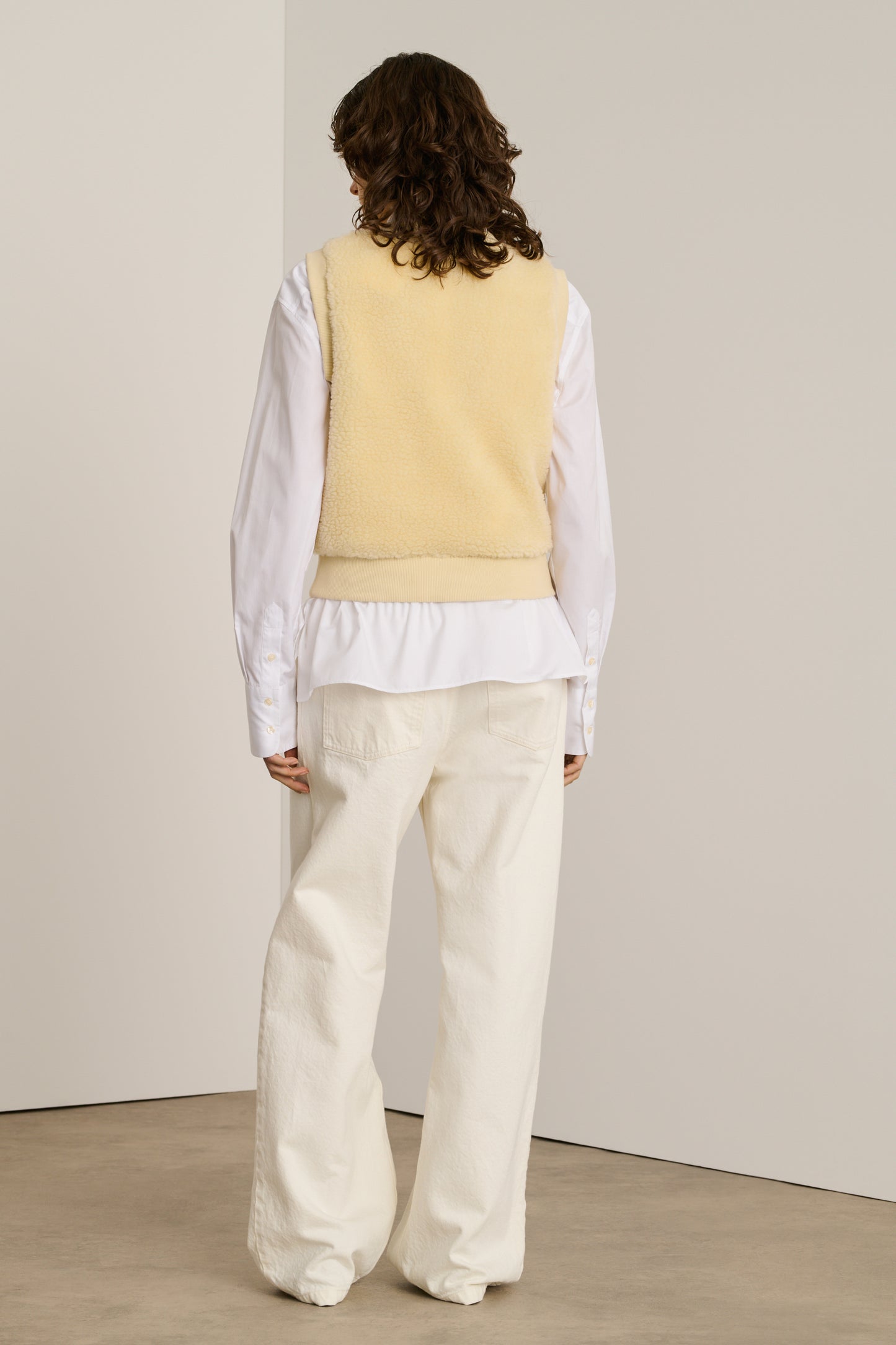 BAILA is a sleeveless sweatshirt made from faux fur. Its straight cut, subtly cinched at the hem, creates an elegant silhouette while providing freedom of movement. Perfect for layering or wearing on its own, this sweatshirt combines warmth and style.
